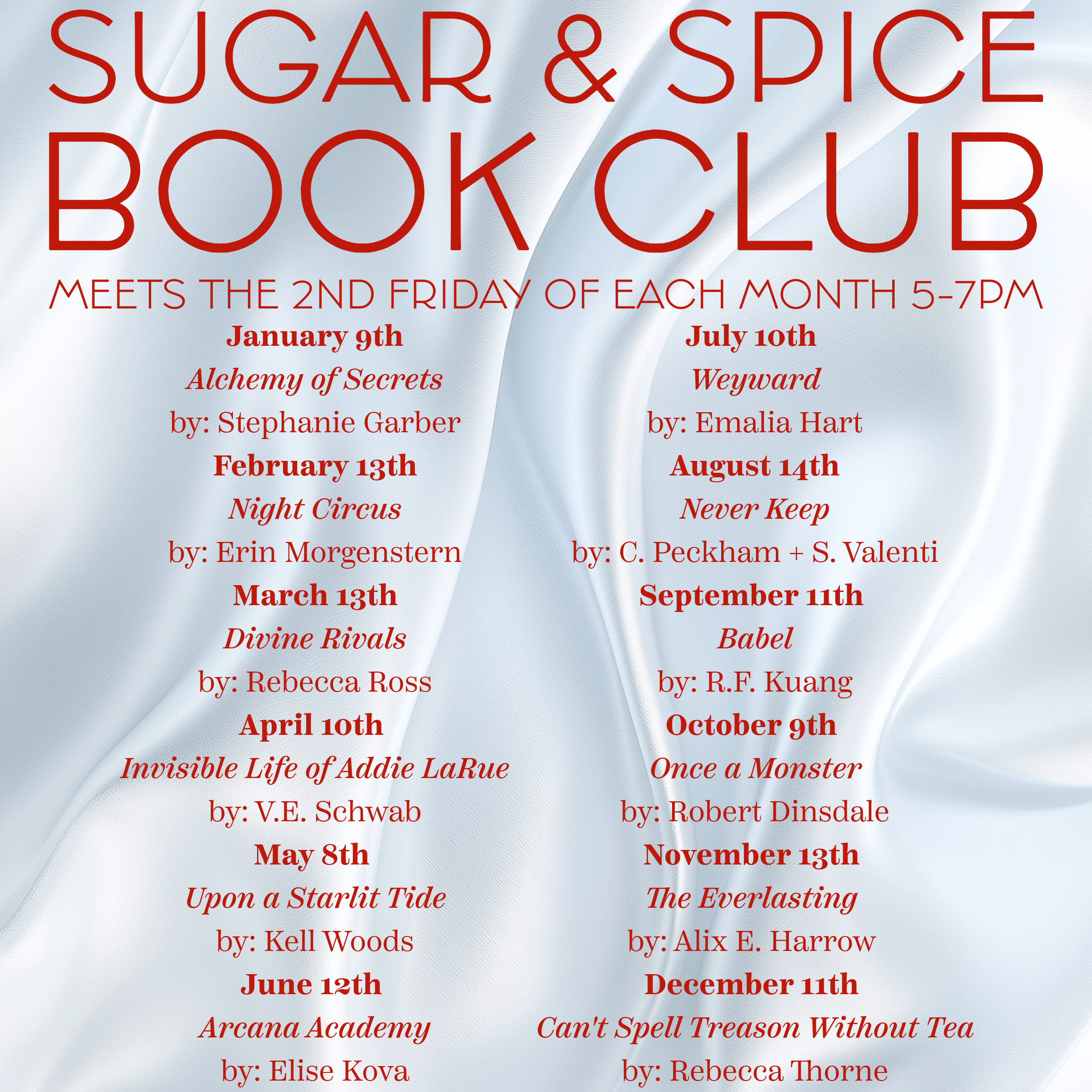 Sugar & Spice Book Club Meeting + Add to Google Calendar + iCal / Outlook export Date Jan 09 2026 Time 5:00 pm - 7:00 pm Share this event